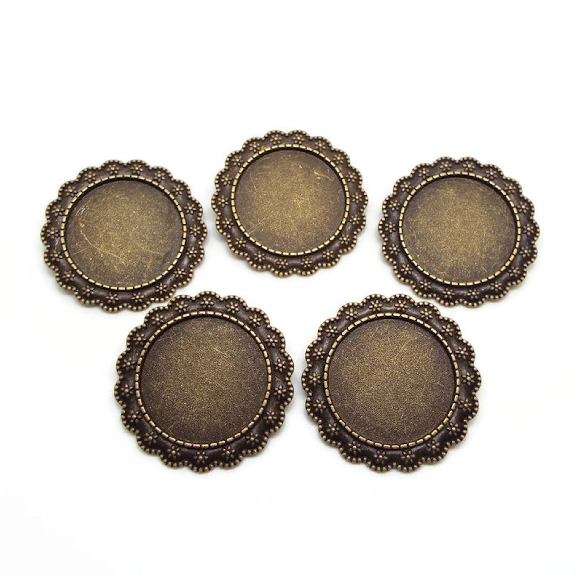 Set of 5 Round Brooch Blanks in an Antique Bronze Tone Metal Alloy with an Iron Pin. The Brooches have a Scalloped Floral Edge and a 25mm Bezel Setting.