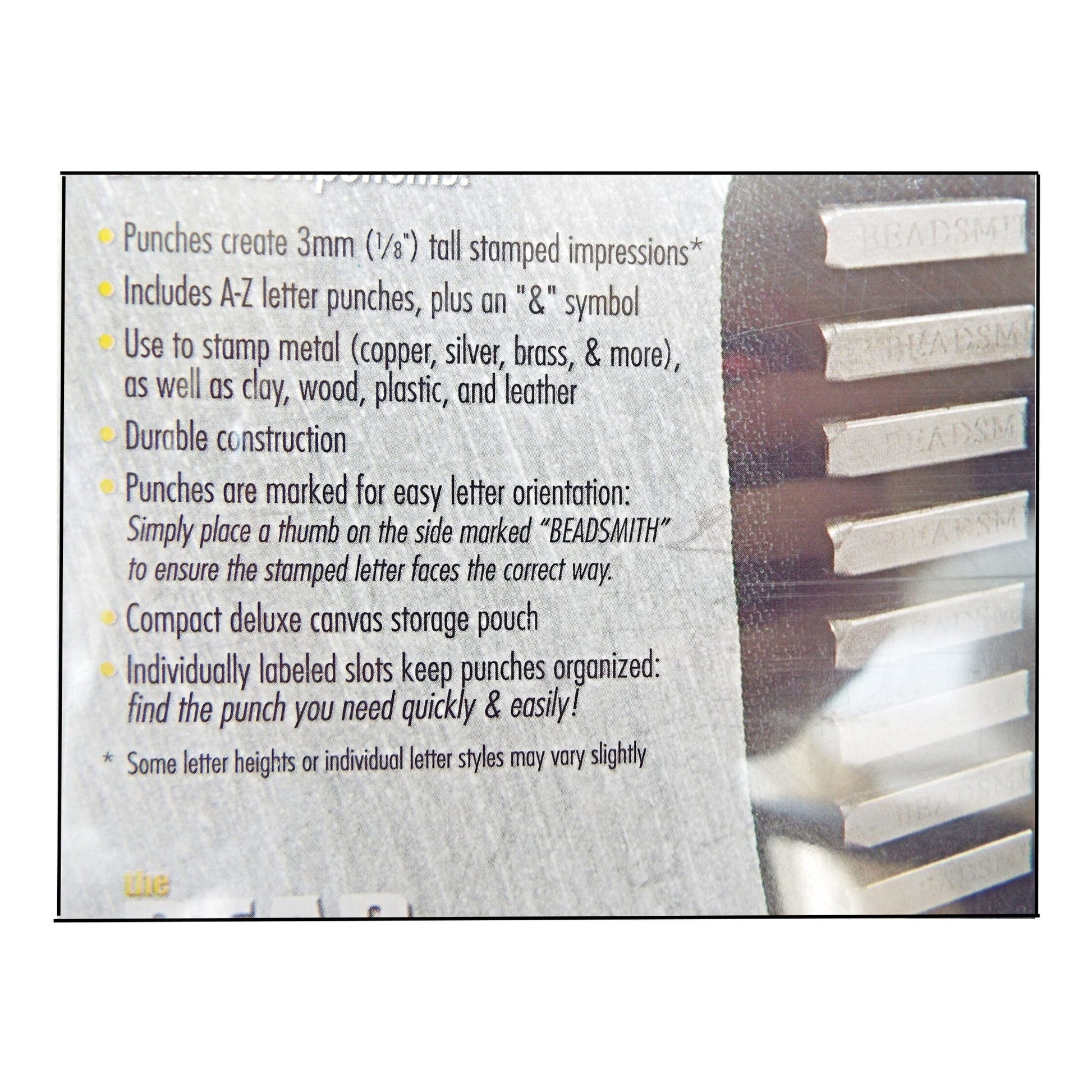 Full alphabet set of 26 plus '&'. Stamp Metal, Clay, Wood, Plastic, Leather. Durable Construction & Compact Canvas Storage Case with Individually Labelled Slots making it suitable for crafting stamped jewellery and DIY crafts on the go.